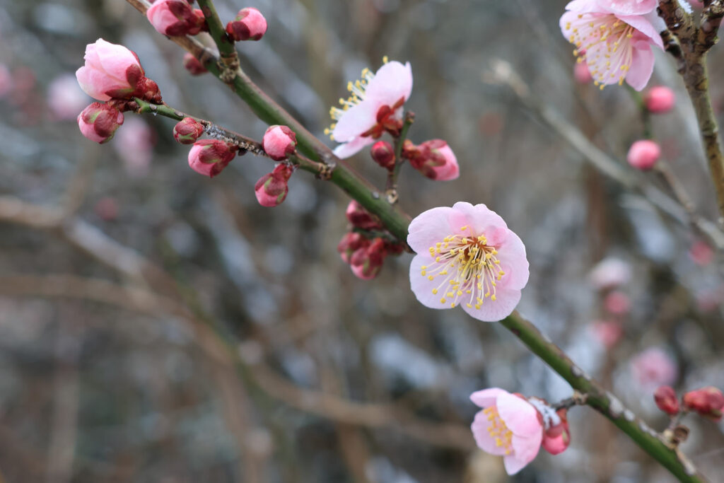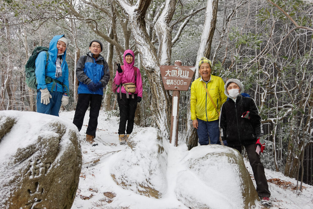 大国見山は、たかだか標高500mの山ですが、寒かったです。6名の参加人数ですが、女性陣の3名は、全員軽アイゼンを持ってきたとのこと。頂上は見晴らしゼロで、集合写真を撮って後、即下山でした。下山後の道端の梅の花に心が和みました。